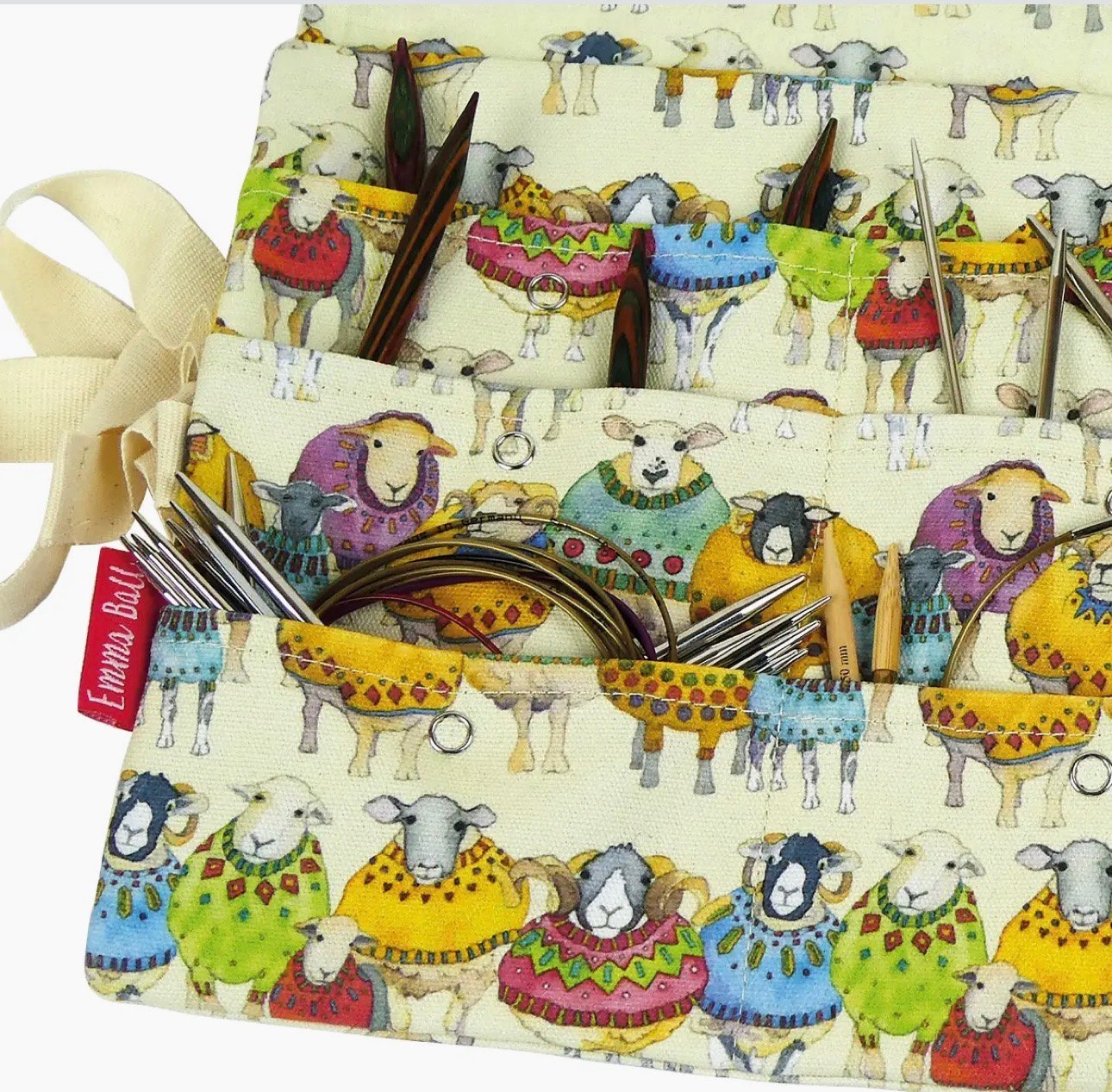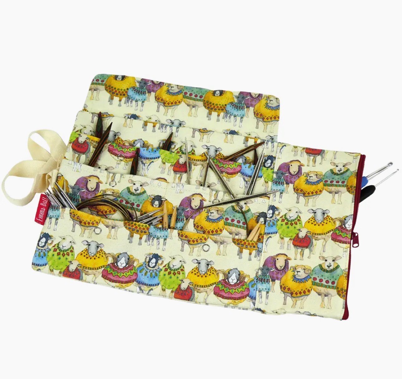 Un fabuloso portaagujas diseñado especialmente para agujas intercambiables, o incluso ganchos de ganchillo. 36 cm para las agujas, con un bolsillo lateral con cremallera de 10 cm, solapa y una corbata extralarga para envolver el rollo. 17 cm de alto cuando está doblado. Su interior tiene prácticos tamaños de aguja impresos en la tela **El