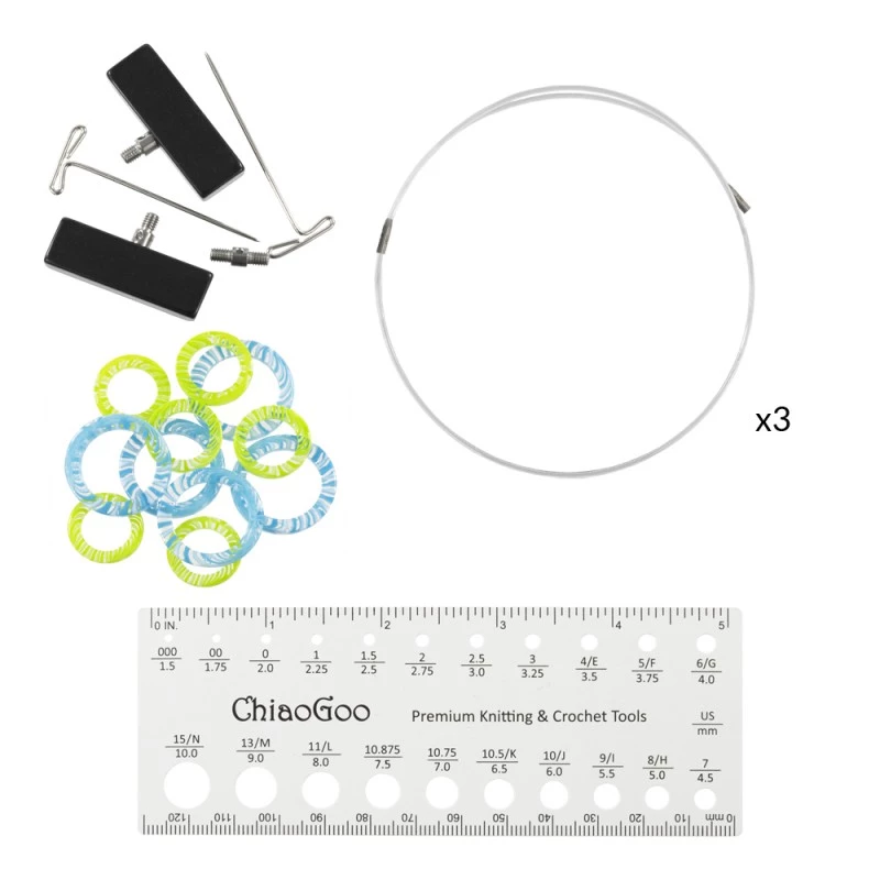 – 6 pares de agujas intercambiables de 13 cm en los grosores: