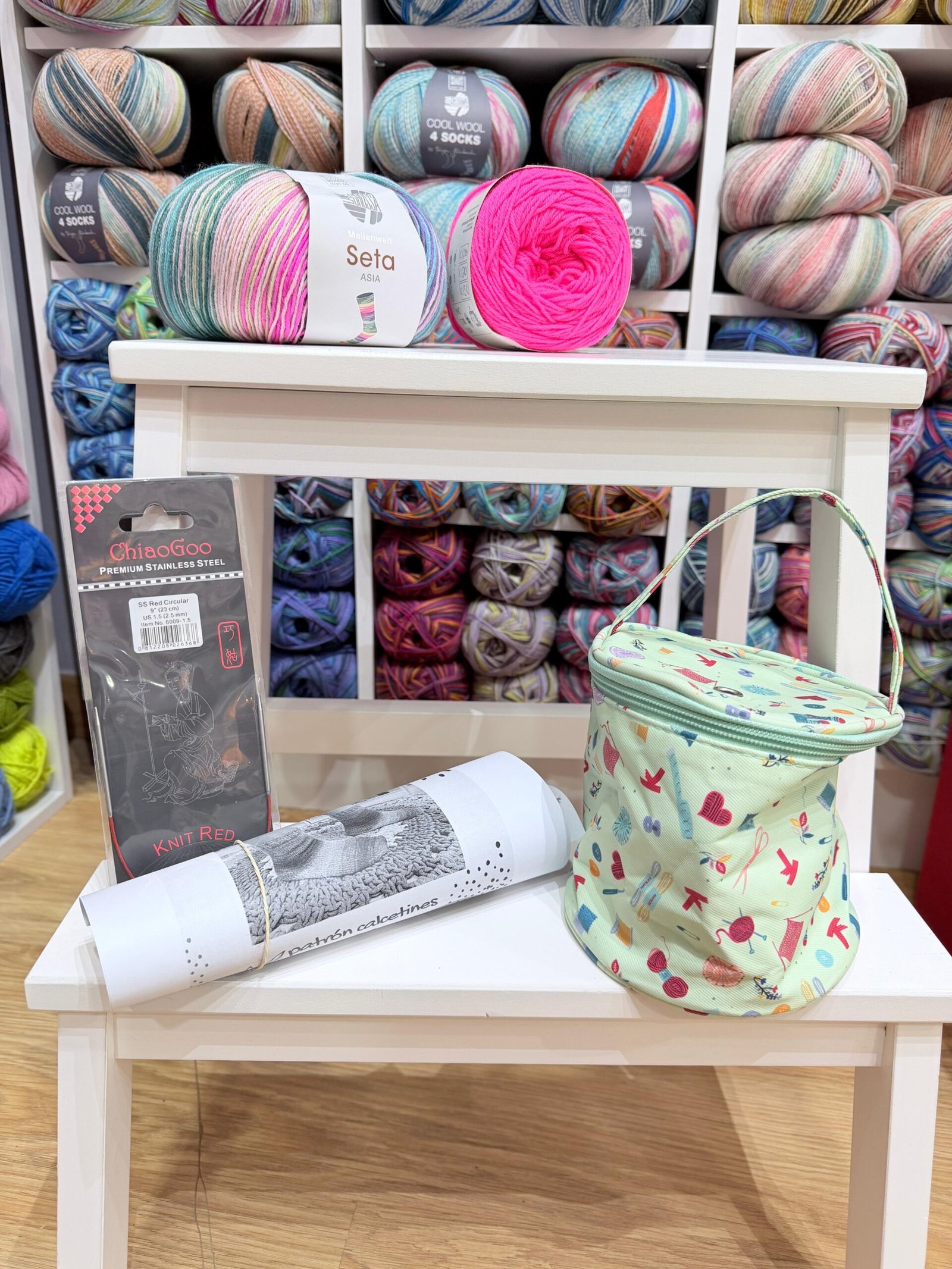 Tienes que elegir 2 ovillos: 1 lana de colorines y 1 lana lisa, 1 aguja y 1 minibolsa portaovillos