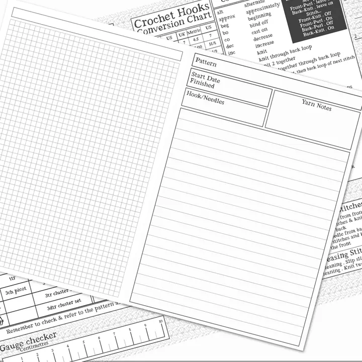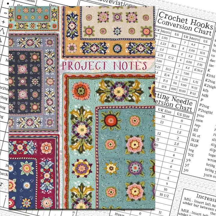 Un práctico bloc de notas de 48 páginas impreso en formato A5. Las páginas de la izquierda tienen cuadrados para diseñar o trazar tus patrones, ¡y la página de la derecha está rayada para tus notas! Aún más práctica: la funda interior tiene esas prácticas conversiones de hilo y aguja, M1R, M1L y punto de cocina, etc., y espacio para colorear en la contraportada si te apetece